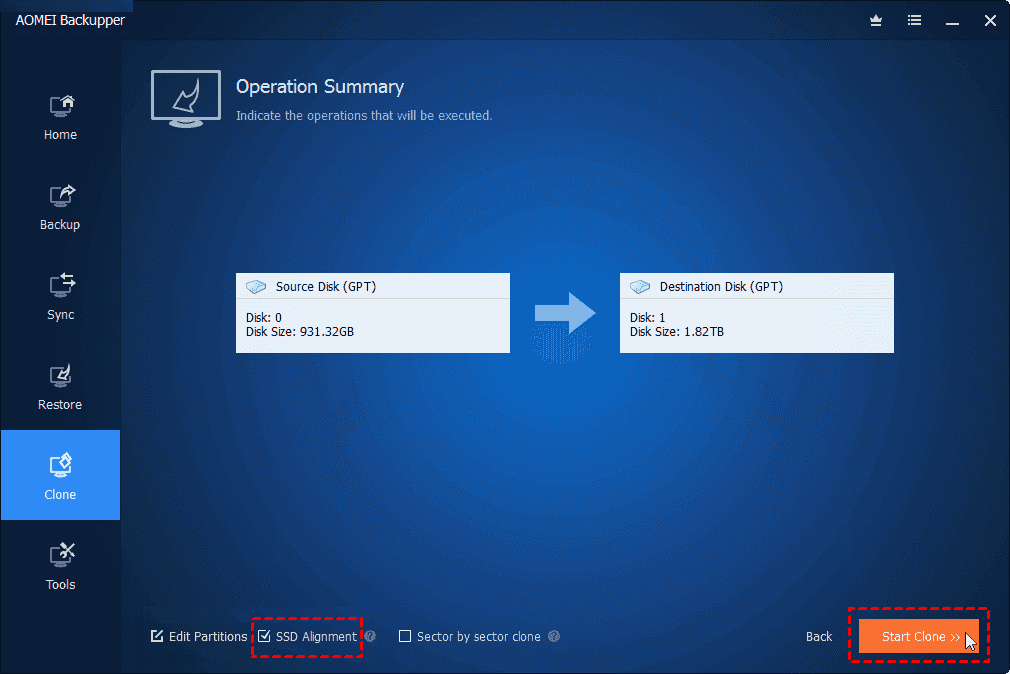 Step 4. Remember to tick the SSD Alignment box to accelerate perusing and composing on your new, roomy SSD. After that, in Windows 10/11, press Start Clone to begin the HDD to SSD cloning process.