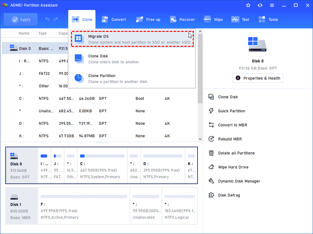 In order to migrate the operating system to an alternative SSD or HDD drive with ease and efficiency, it is recommended that you utilize migration software for Windows 10, such as AOMEI Partition Assistant. This is a Windows partition manager that is capable of harnessing the full potential of the disk and effectively managing partitions.